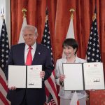 U.S. President Donald Trump (L) and Japanese Prime Minister Sanae Takaichi (R) hold up signed documents for a critical minerals/rare earth deal with Japan during a meeting at Akasaka Palace on October 28, 2025 in Tokyo, Japan. Trump is on a visit to Asia that takes in the ASEAN summit in Malaysia, followed by a trip to Japan and South Korea ahead of the APEC meetings.